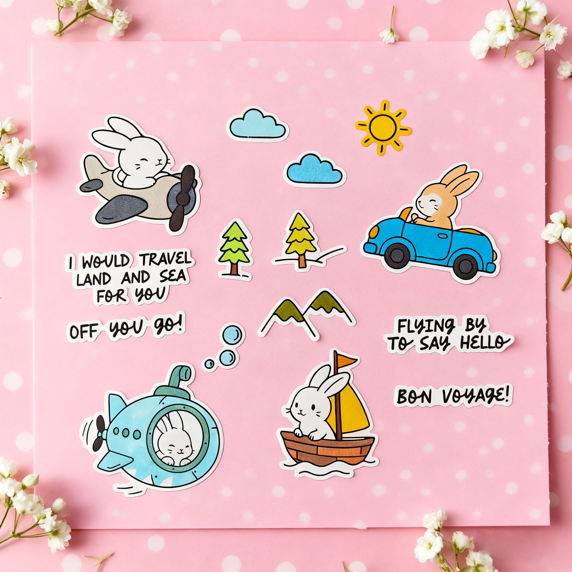 Adventure is calling! The Travel Land and Sea Clear-Die Set (4x6 inches) features adorable bunnies exploring the world — flying an airplane, driving a car, sailing a boat, and even diving in a submarine. With playful accents like clouds, mountains, trees, and cheerful sentiments (“Off you go!”, “Flying by to say hello”, “I would travel land and sea for you”, “Bon Voyage!”), this set is perfect for fun and adventurous craft projects.